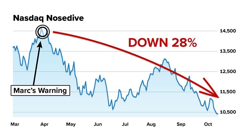 When trouble began to hit the markets in 2022, Marc urged his followers to stay out of tech stocks, right before the Nasdaq plunged 28%.