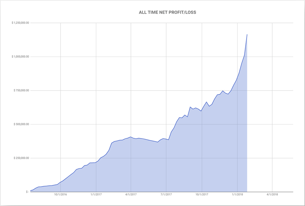 “I hit a million dollars in lifetime trading profits on January 18th, 2018. I didn’t realize it until the day was over. I knew I was close, but I try not to focus on the numbers while I’m trading. Sometimes I even hide my p/l during the day. I tell myself every morning to focus on the process and at the end of the day the results will work themselves out. If I trade well and trade my plan, I don’t need to worry about how much money I make or lose on each trade – just that I trade the way I want. I don’t even know how I’ve done it, but so far in 2018 the total profit is up to $340k. It’s honestly just been a blur. I can look back at my tracker and read through my daily trading journal, and it’s all there.